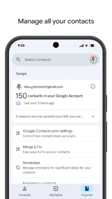Contacts آپ کے تمام رابطوں کو تمام آلات پر محفوظ طریقے سے بیک اپ اور ہم آہنگ کرتا ہے۔ گوگل اکاؤنٹ میں محفوظ کریں، کہیں سے بھی رسائی حاصل کریں۔ حذف شدہ رابطوں کو بحال کریں، انہیں منظم رکھیں، اور اہم تاریخوں کی یاد دہانیوں کے ساتھ اپ ٹو ڈیٹ رہیں۔